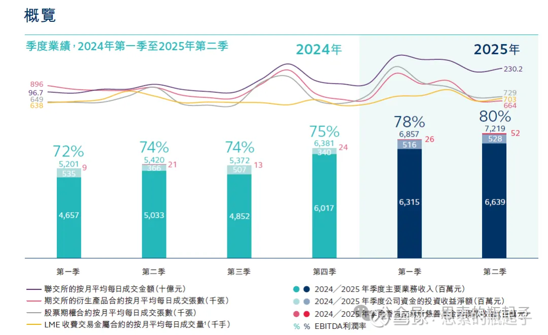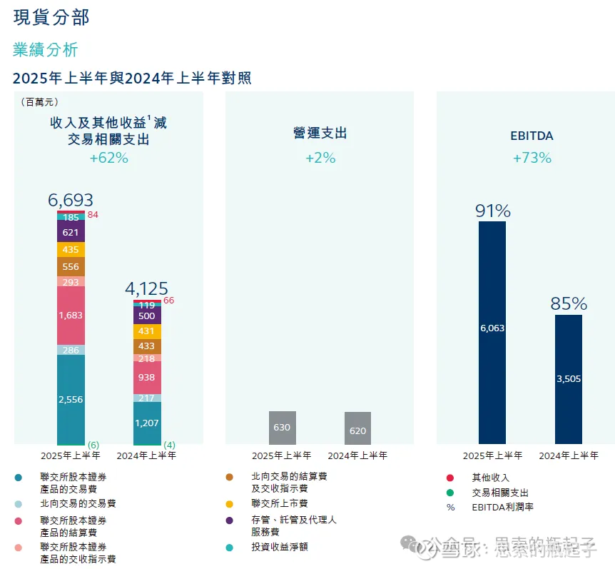 这里对比一下公司现货分部,2025年上半年与2024年同期可知,交易费与结算费均大幅上涨,在运营支出未发生明显变化的情况下,利润大增。其他分部也有增长,只是没有现货分部增长这么多。