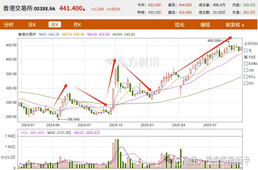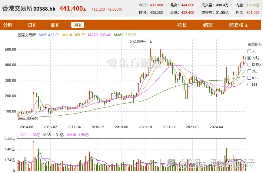 最近随着股市回暖,港交所股价持续上涨,我觉得本轮牛市,它超过之前的股价最高点,是问题不大的。拉长时间来看,港交所长期趋势也是向上的,趁它在股价低点买入后长期持有,也是个不错选择。