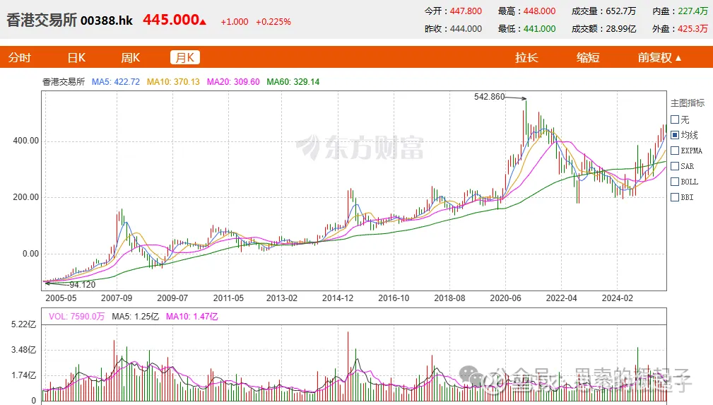 从这张20年的月K线截图也能看出来,港交所是一只长牛股,长期趋势稳定上涨。中间波动比较大的时候,都是各个牛市时期,哪怕牛市被套,以港交所的成长性,未来解套也不用担心。