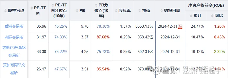以上是我找到的,港交所和美股几家上市交易所的估值对比,后三个市值单位都是美元。从PE估值对比,港交所和洲际、纳斯达克交易所的估值相近,但分位点更低,从PB来看,港交所的PB最高。但这里也要特别说明一下,港交所走的是轻资产运营路线,所以它的PB更高也可以理解。
