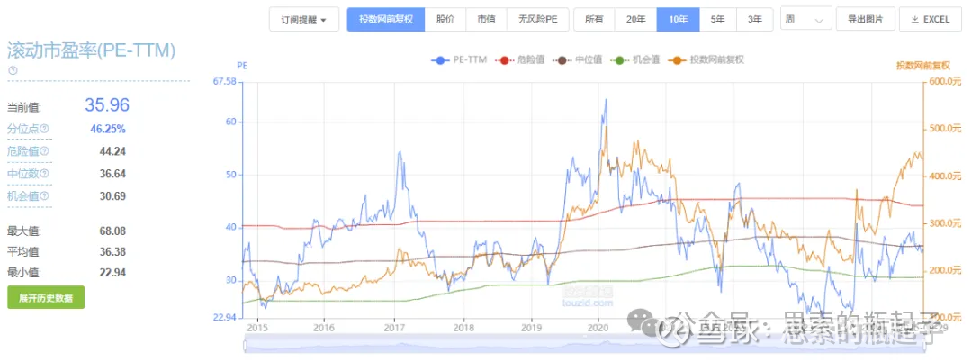 从PE历史来看,港交所的PE在23-68倍之间波动,牛市顶点会出现最高值,而熊市底部会出现最低值。目前随着港交所股价暴涨,公司PE也快速上升至36倍,已经回到了中位数与平均值附近,所以说现在投资港交所,肯定是从趋势投机,而非价值投资视角,才能买入。