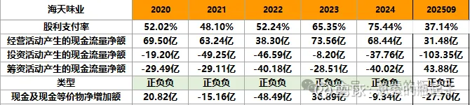 海天的现金流一直都没问题,今年类型变成正负正,也是由于在港股上市融资的原因,整体看来问题不大。最近两年开始主动提高了分红水平,这也是个好现象。