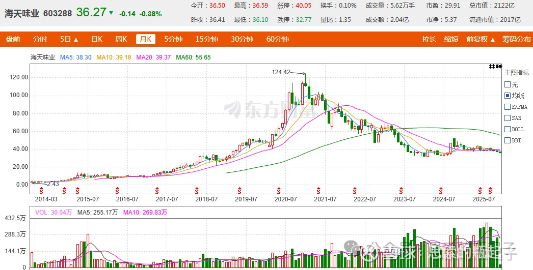 但后续随着白马抱团的瓦解,海天味业的股价也从最高124元,一路回撤至35-40元左右来回震荡,着实套牢了一大批投资者,连带对价值投资也是恨得牙痒痒。