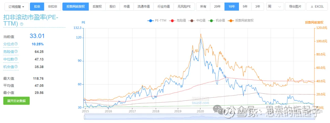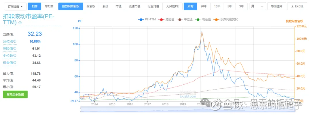 公司目前扣非滚动市盈率为32.23倍,处于10年历史10.85%的分位点。虽然我总是在个股估值分位点低于20%后,就标黄提醒,但我也说过很多次,我自己常常会在分位点低于5%甚至1%以下,才选择出手,心急吃不了热豆腐。