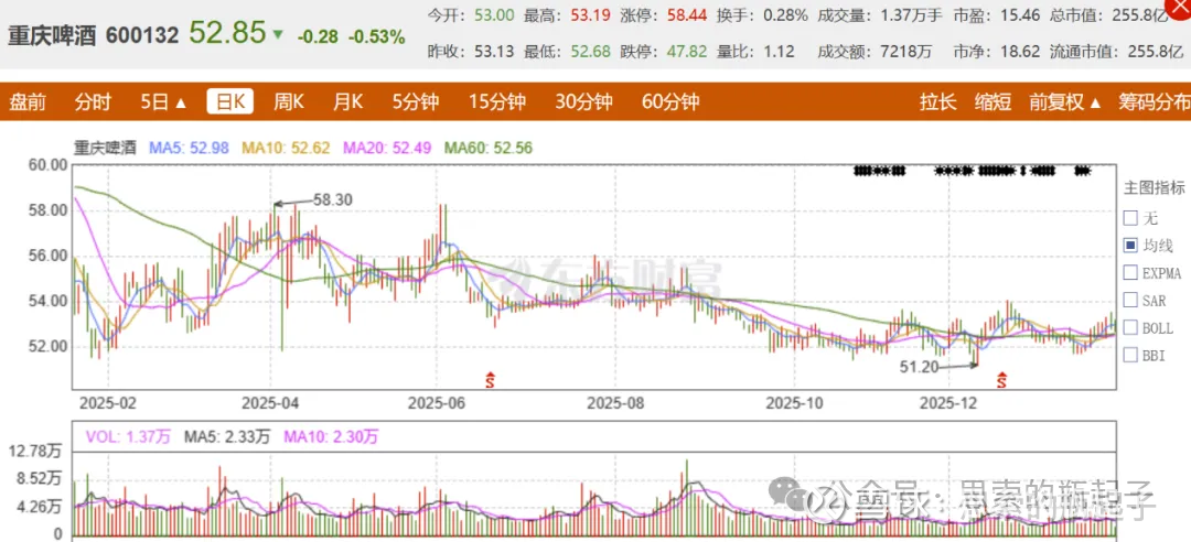 今天分析$重庆啤酒(SH600132)$ 重庆啤酒,我感觉关注它的人很多,公司股价在2025年,几乎走出了个“一”字,跟上海机场有一比。