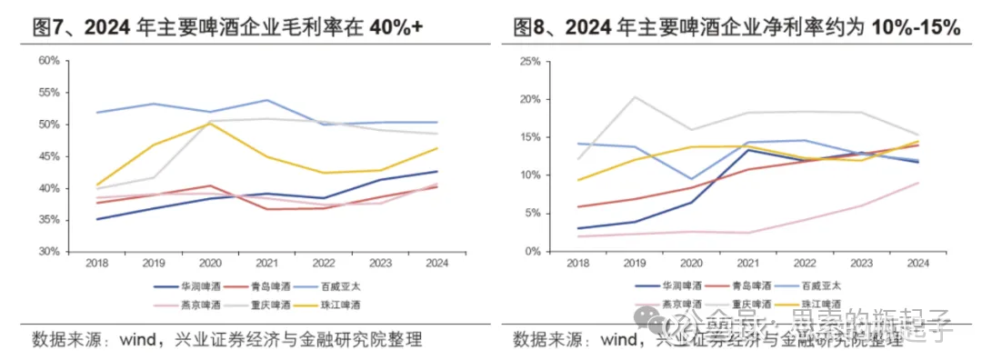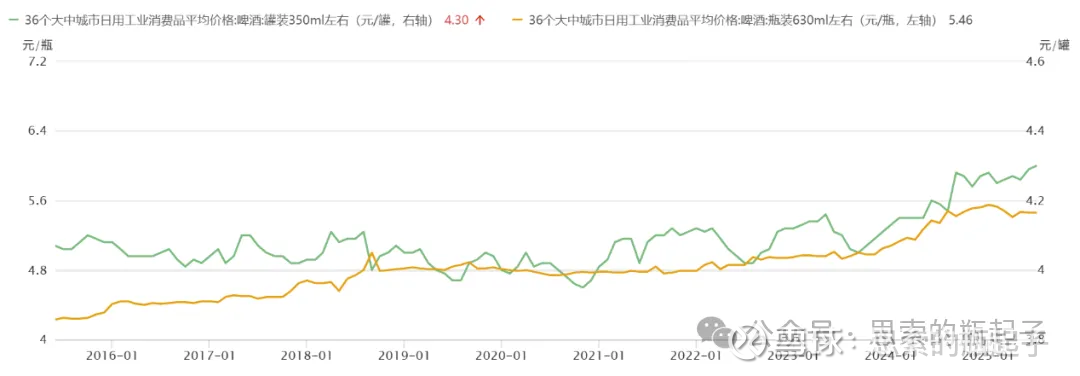 价格方面,我这里只有2015年之后的数据,罐装啤酒自2024年后开始出现一波缓慢的涨价趋势,而瓶装啤酒在2019年之前和2022年之后,均呈现缓慢的价格上涨。