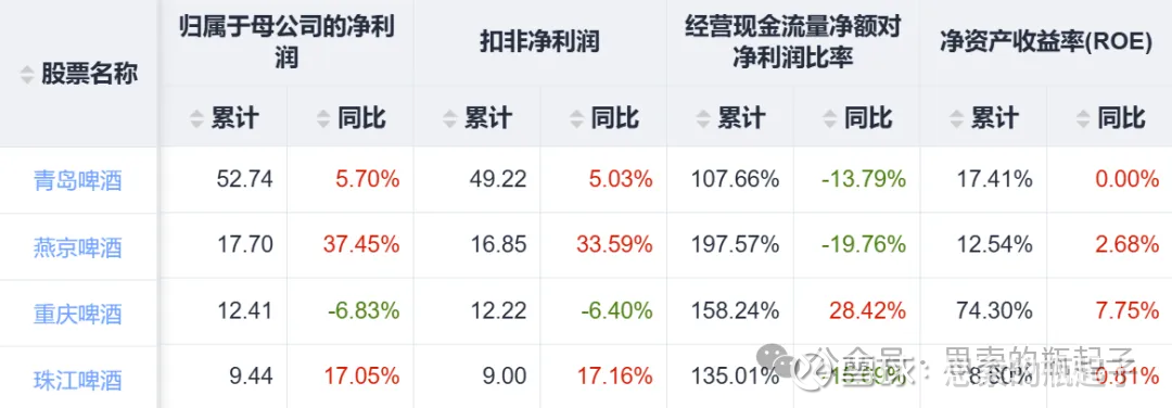 最后25年前三季度净利润方面,只有重庆啤酒是下滑的,另外三家都在增长,这可能说明,主打中高端产品的重庆啤酒,遇上了消费降级,受到的影响也相对更大。
