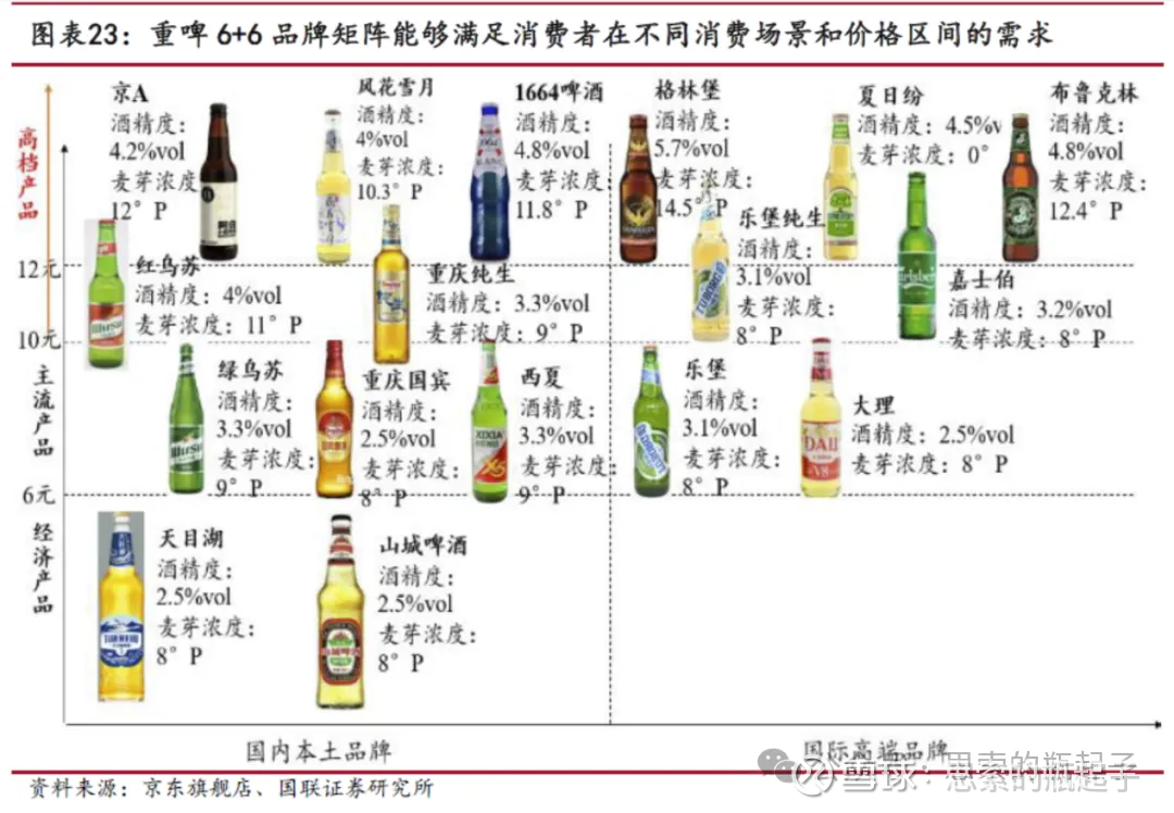 价格段方面,本土品牌和国际品牌均有多种中高端产品布局,从上图也能看出,重庆啤酒的多数产品均面向中高端市场布局。