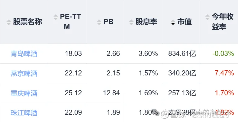 啤酒企业中,重庆啤酒的PE估值是最高的,PB更是高出了一大截,这个股息率指标有点问题,应该是系统计算出了错。