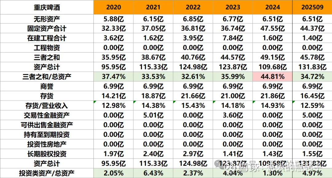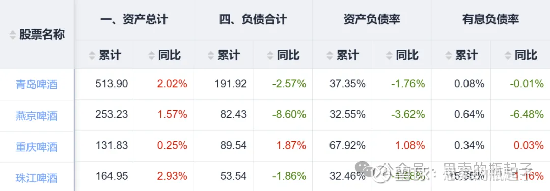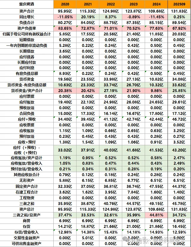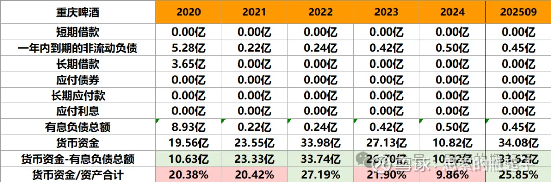 现金占比方面重庆啤酒也是相对较低的,好在没什么有息负债。