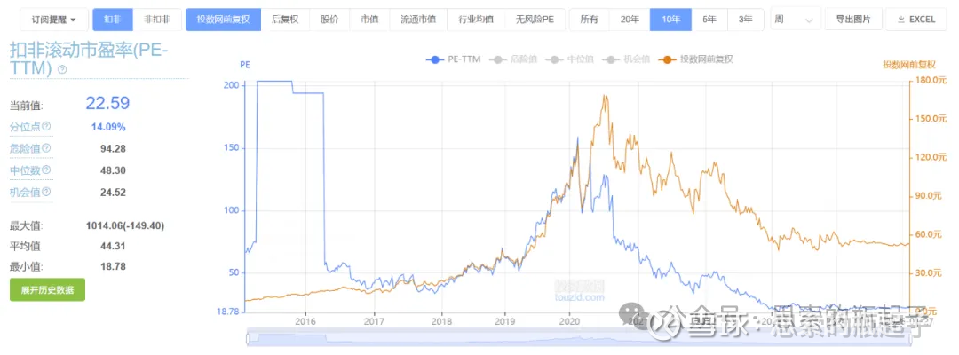 公司目前扣非滚动市盈率为22.6倍,处于自身10年历史14.1%的分位点。从走势图能看出,19倍PE大约是一个历史级别的底部,当然如果公司未来失去了成长性,我觉得最多给个15合理PE吧。