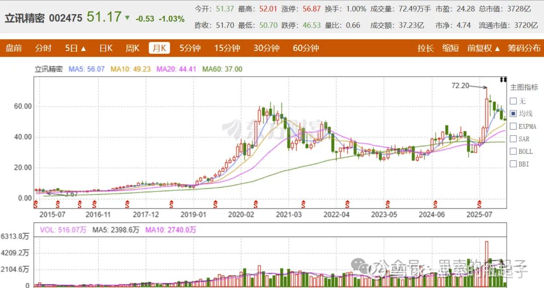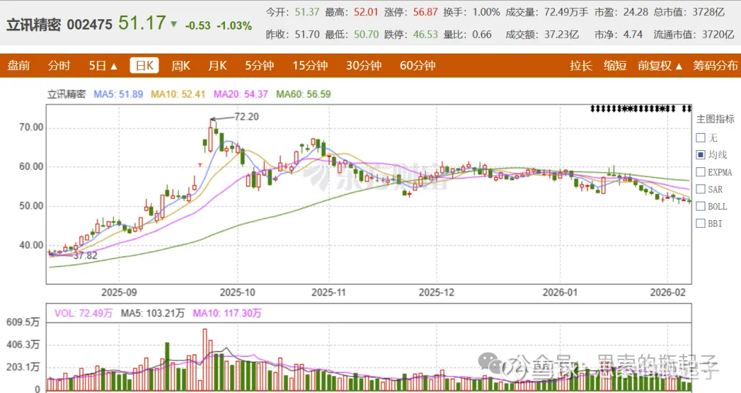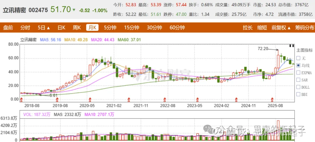 比如立讯精密去年9月股价72.2元见顶后,已经连跌5个月了,目前相对最高点,跌幅也有30%,而这种波动在我多年观察立讯精密的历史中,那真是太常见了,所以不了解它就盲目下手的朋友,还是要控制好风险。