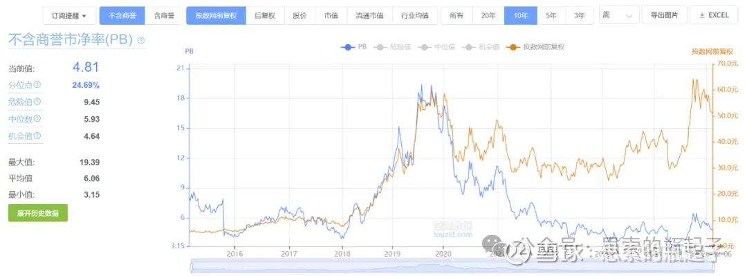 当前公司不含商誉PB指标为4.8倍,位于10年历史25%的分位点,相对还可以的样子,但肯定不是低估区间。