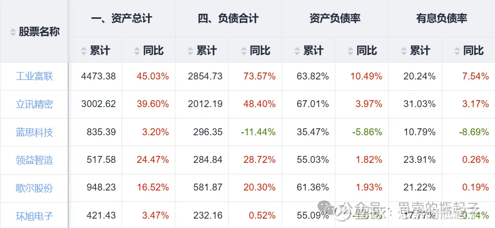 从资产负债率和有息负债率来看,工业富联和立讯精密均在扩大债务规模,通过债务驱动产能与规模扩张,成长性依然领先于其他企业。