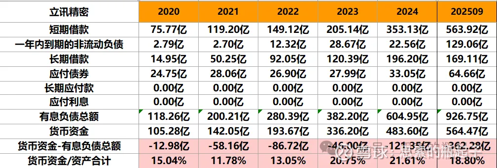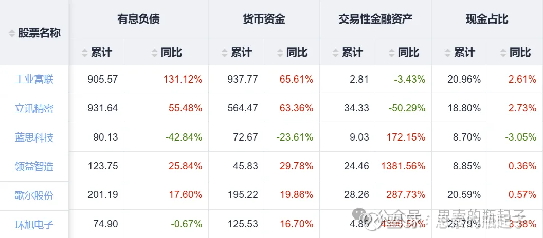 从有息债务来看,工业富联和立讯精密都在大幅增长,两家的现金占比都在20%左右,明显立讯的债务更多而现金更少。