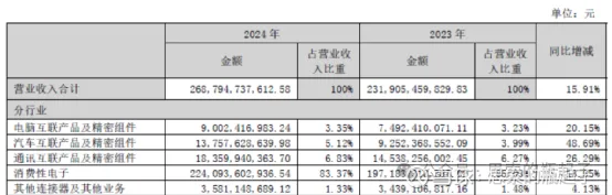 从2024年分行业的营收情况来看,消费电子毫无疑问是第一大板块,虽说增速不是特别高,但绝对值很大,依然是营收增长的主要动力。