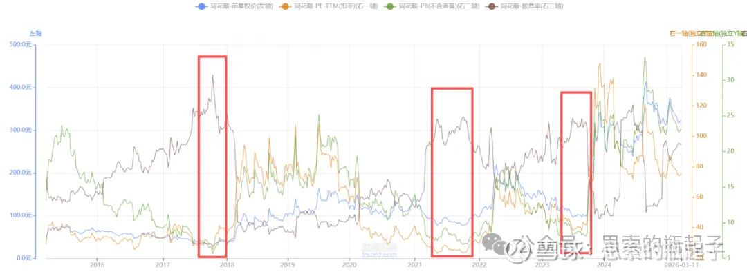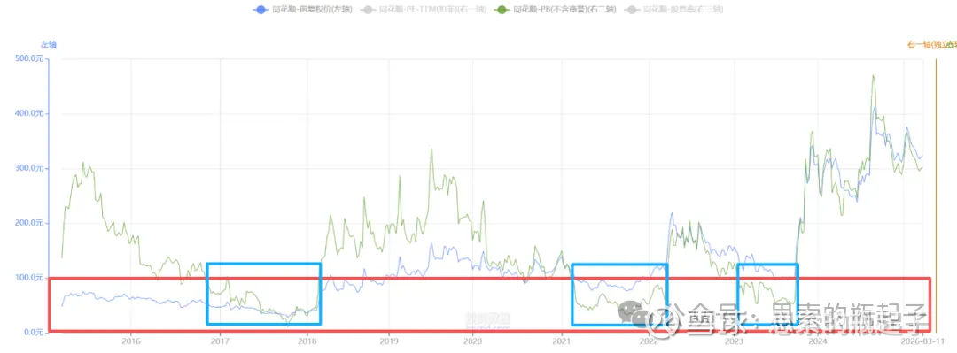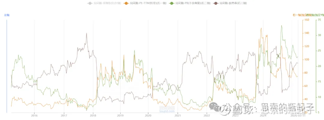 隐藏掉股价相对更直观。当然同花顺的股息率一直不够高,并且作为周期股,它的PE指标有可能会失真,所以我自己用它看同花顺的时候,一般主要看PB,PE和股息率只是辅助,看个相对高低位置关系。