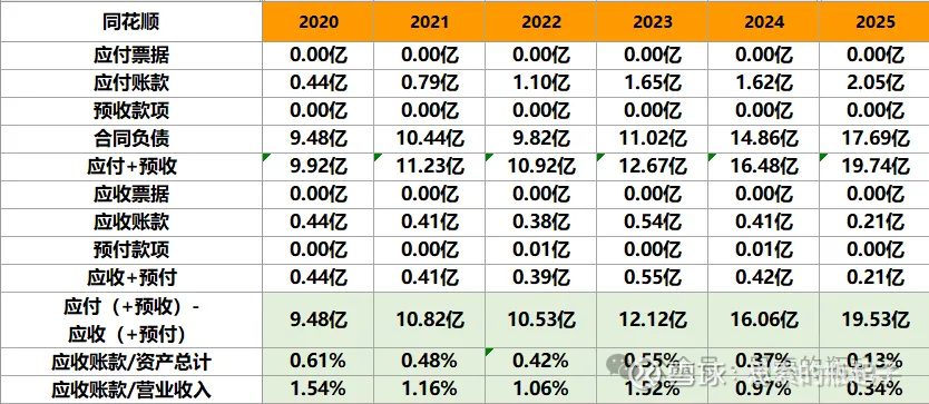 周转经营性账款方面,公司应收账款金额极低,合同负债较高。由于软件服务费就跟教培啊健身房啊,生意貌似很像,都是客户先付费,再享受服务,所以这方面同花顺也属于先收钱,后服务,就体现为合同负债的金额较高,这也算是它的经营性占款吧。