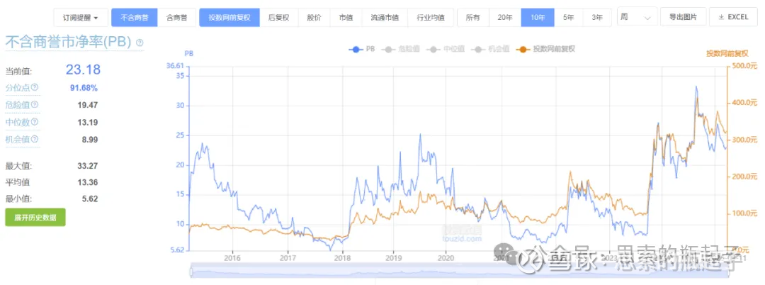 当前公司不含商誉PB指标为23倍,位于自身10年历史91.7%的分位点,这个估值参考性就高多了,与股价同步性更好,估值也算是非常贵,啥时候它再跌回10倍以下,我再考虑。