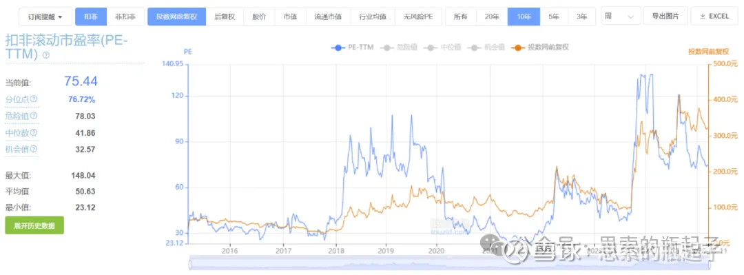 公司目前扣非滚动市盈率为75.4倍,处于自身10年历史76.7%的分位点,这个数据有点误差,应该是还没更新最新的年报指标,我手算了一下,大约为57倍,肯定也不算便宜。