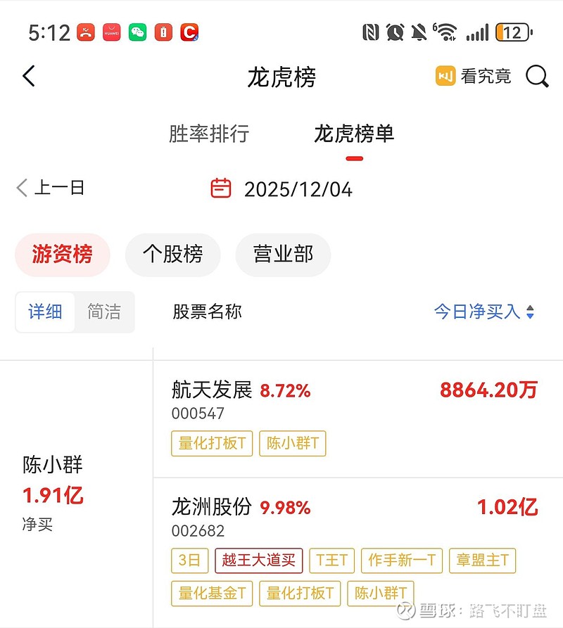 顶级游资大佬陈小群又入了航天发展和龙洲股份,不得不说,这眼光有点绝。