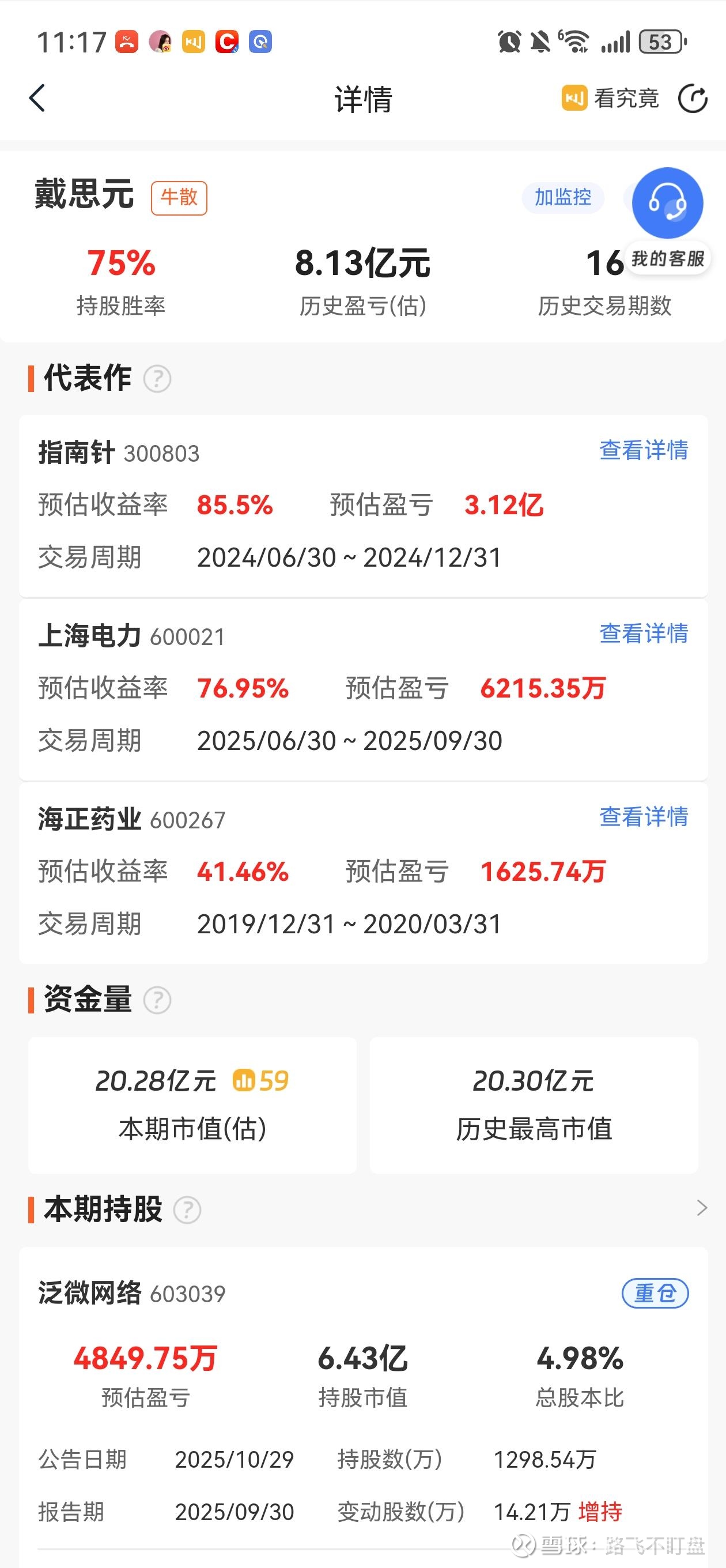 在大A的浪潮中,有这样一位低调且又无法忽略的玩家,他就是戴思元。,每季度财报披露的持仓数据 是他唯一公开的踪迹,除此之外再难寻其他踪迹。截至 2025 年 6 月,他手握泛微网络、北京君正等 4 只核心标的,总市值超 17 亿元,而巅峰时曾突破 20 亿。