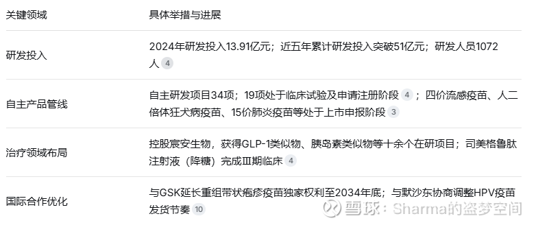 关键领域具体举措与进展研发投入2024年研发投入13.91亿元;近五年累计研发投入突破51亿元;研发人员1072人自主产品管线自主研发项目34项;19项处于临床试验及申请注册阶段;四价流感疫苗、人二倍体狂犬病疫苗、15价肺炎疫苗等处于上市申报阶段治疗领域布局控股宸安生物,获得GLP-1类似物、胰岛素类似物等十余个在研项目;司美格鲁肽注射液(降糖)完成Ⅲ期临床国际合作优化与GSK延长重组带状疱疹疫苗独家权利至2034年底;与默沙东协商调整HPV疫苗发货节奏。