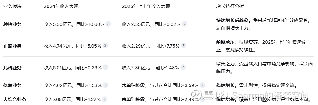 正畸业务:作为公司传统的核心高毛利业务之一,正畸业务增长面临挑战。根据2024年年报数据,该业务收入同比下降了5.05%。这可能是由于市场竞争加剧、消费者对隐形矫治等细分领域的价格敏感度提升所致。同时,市场对正畸项目可能纳入集采范围的担忧,也构成了潜在压力。