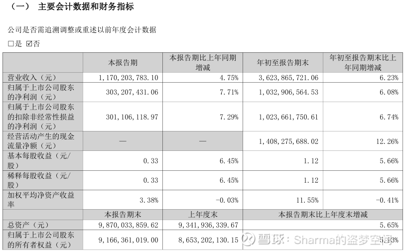 营收与利润稳中有进:2025年1-9月,公司实现营业总收入36.24亿元,较上年同期的34.11亿元增长6.23%;实现归属于上市公司股东的净利润10.33亿元,同比增长6.08%。扣非后净利润为10.24亿元,同比增长6.74%,说明利润增长主要来源于主营业务。