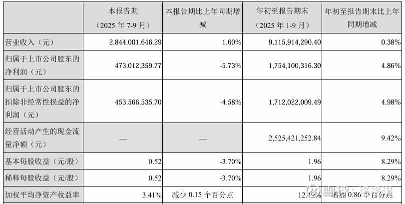 归母净利润:2025年前三季度为17.54亿元,同比增长4.86%。2024年同期为16.73亿元,同比增长4.44%。净利润增速稳中有升,且持续高于营收增速,反映出公司盈利质量和费用控制能力的提升。