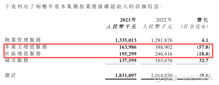 业绩报称调整的理由是为更好的业务构成。调整的结果显而易见,没调整前,2023年四大业务收入中有两个负增长,分别是非业主增值服务和社区增值服务。但合并同类项后,负增长收入只有一个了。