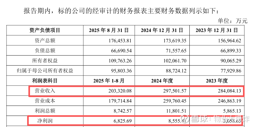 根据公告,标的2023年、2024年和2025年前8个月,营收分别是28.41亿、29.75亿和20.33亿,净利润分别是3059万、8555万和6825万。