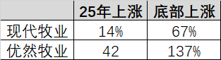 从下一个周期顶部预测,毛估估推测现代牧业利润可能到15亿,优然牧业到20亿,二者分别给15和13PE,现代牧业225亿vs260亿,未来该有2~2.5倍左右的空间。