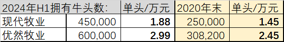 查阅二者的奶牛存栏数,2024半年报:现代牧业45万头,优然牧业60万头;再查阅2020年末的存栏数:现代牧业25万头,优然牧业30.82万头。(本想查阅2019年的,但优然牧业缺失数据)