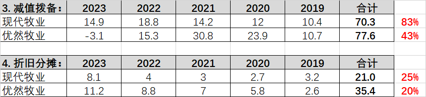 从图表2的固定资产看,优然牧业175亿对现代的85亿,高出一倍多!但过去5年的减值拨备总和,优然牧业77.6亿,仅比现代牧业的70.3亿多一点点。如果用5年的总减值拨备除以现在的固定资产,优然牧业减值远远没有现代牧业充分!这还不包括现代牧业刚刚发布的24年业绩预告说的十几亿减值。