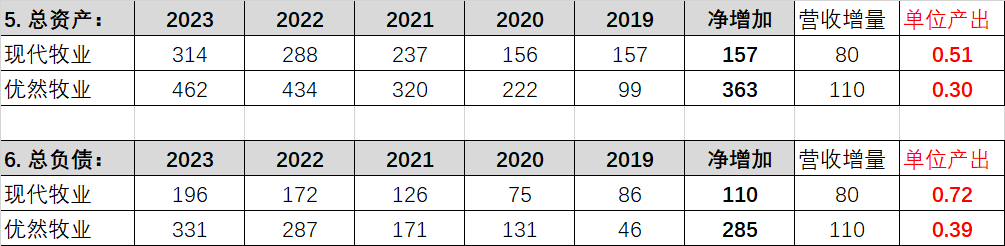 从总负债来看也是这样,现代牧业5年间增加负债110亿,每增加1元负债增加0.72元产出;而优然牧业增加了285亿负债,每增加1元负债仅增加了0.39元产出!从资产经营效率上也是远不如现代牧业的!