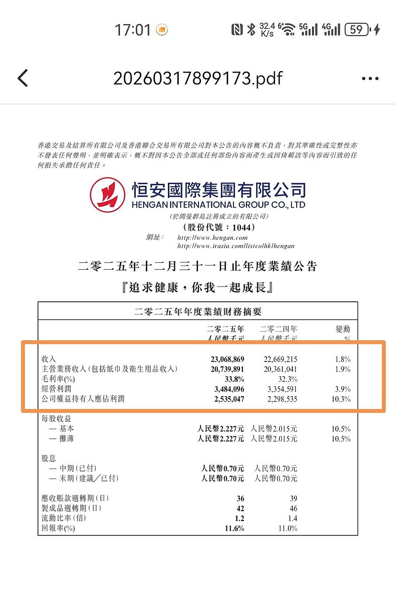 $恒安国际(01044)$ 业绩不错,超我预期!,下午大盘的大幅回撤压制了应该上涨的幅度,未来几天看看有没有良好表现?销售增长2%,毛利率增长1.5%,净利润增长10%!在这样的经济大环境下,很棒了!尤其是下半年表现!这样的业绩和60%的派息率、5.7%的股息、1.3的pb、13的PE,拿着感觉挺安稳的!@今日话题