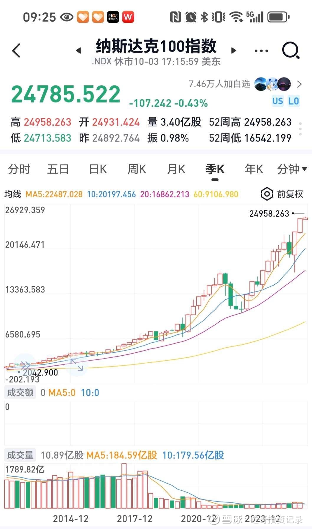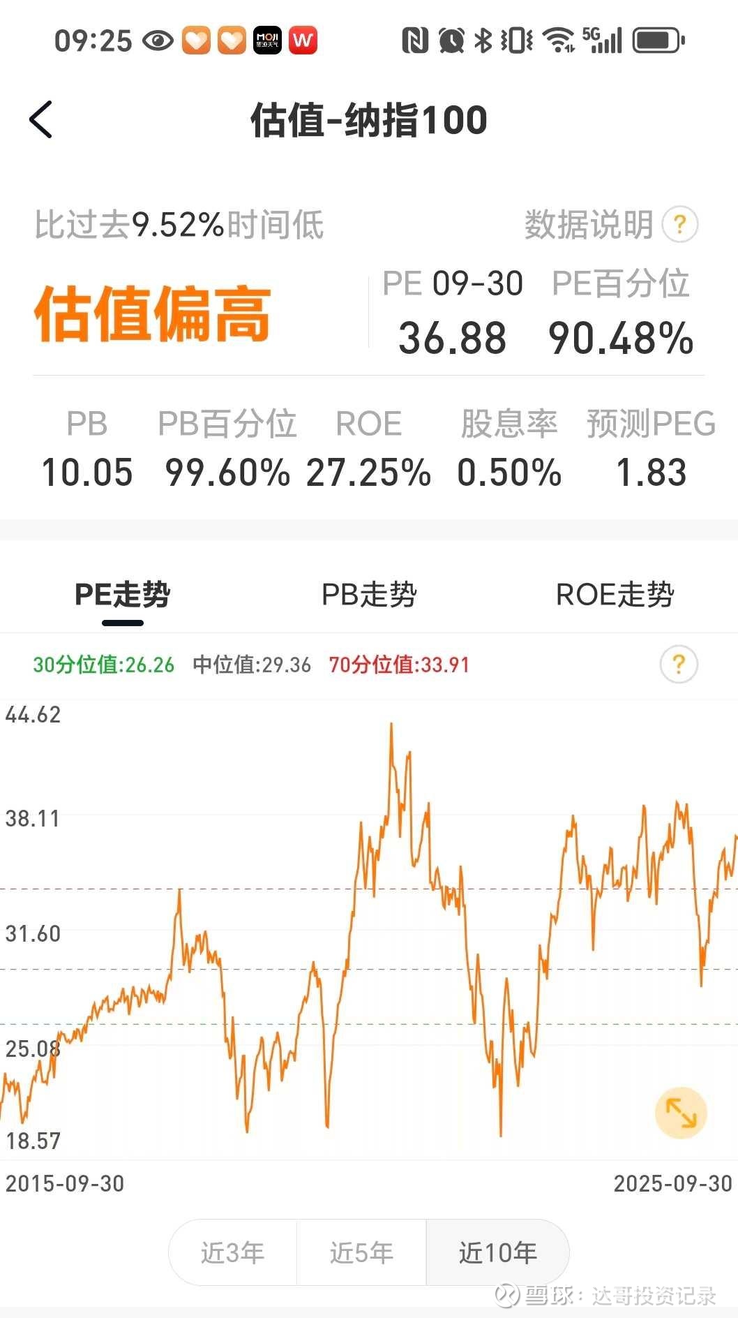 过去 10 年,纳指 100 的 PE 始终在20 - 40 倍区间波动(如图 1 中 PE 走势的历史分位、当前 PE 36.88 仍处于该波动带),但指数却大幅上涨约 5 倍(图 2 长期季 K 线的趋势性上升)。这说明:纳指 100 成分股的
