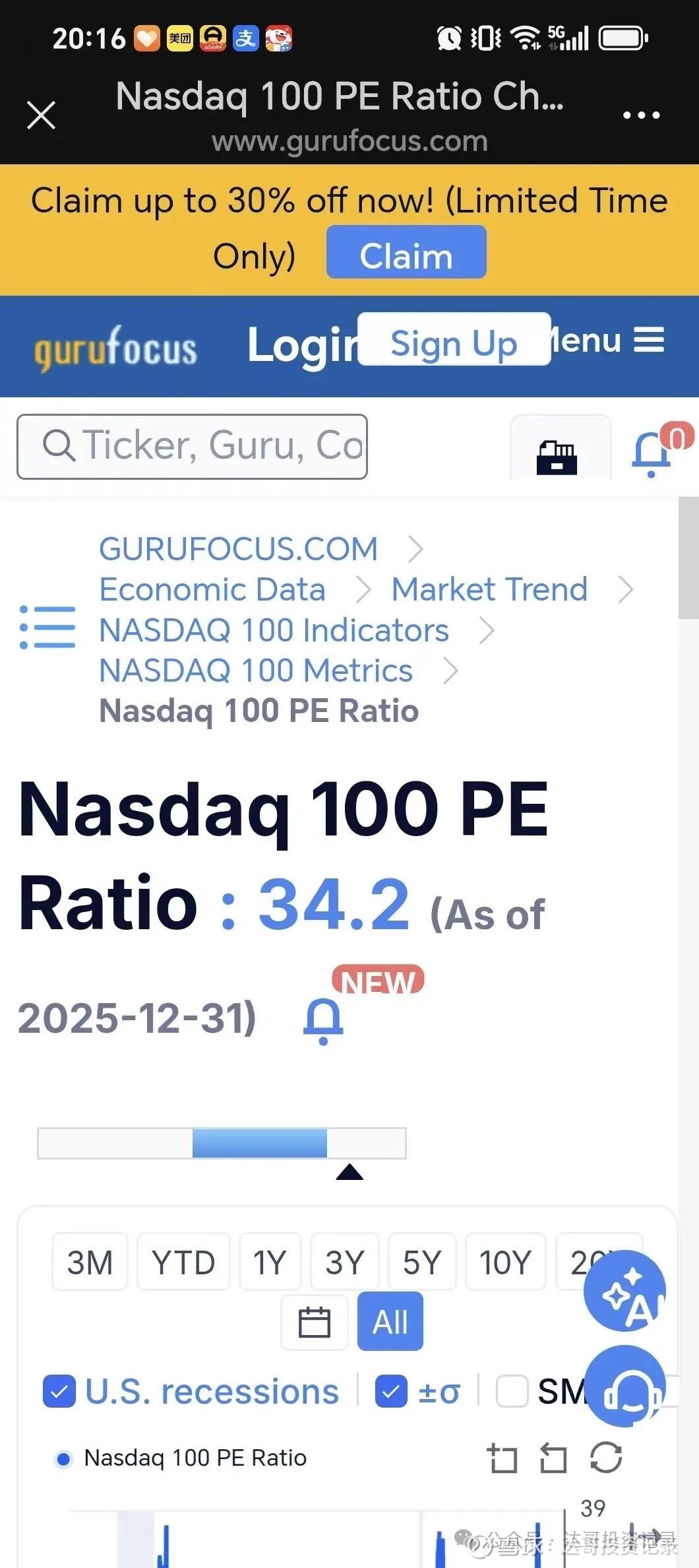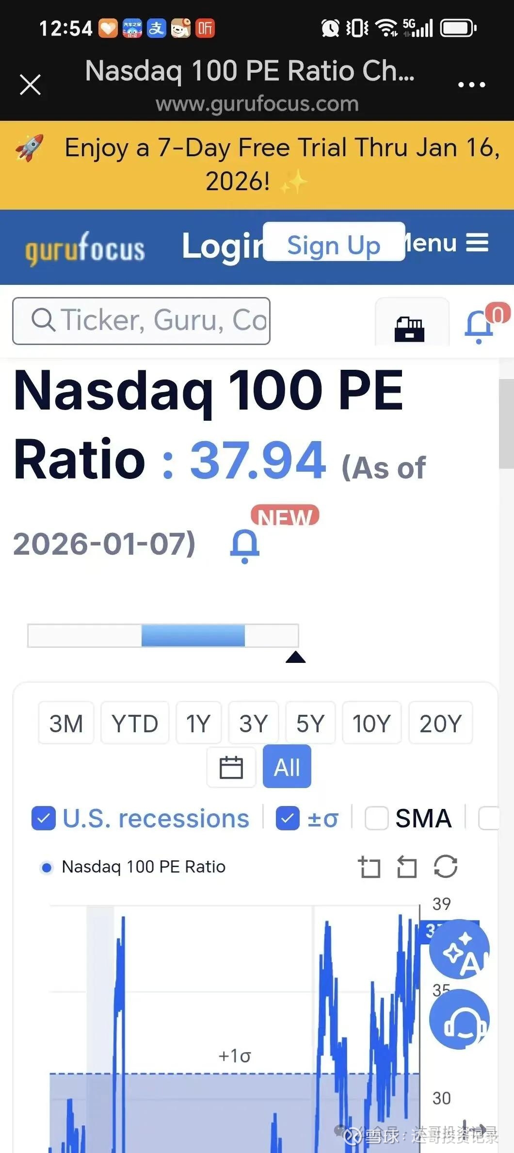 新年后国外网站GuruFocus(中文常称“价值大师网”)的PE数值出现变化,比原先的数值高出接近10%,但纳指100新年后的波动性很小,不到一个百分点,12月31日纳指100的pe数值是34.2倍,1月7日的pe数值是37.94倍,通过AI大模型找到原因可能是:2025年12月31日处于美股财报季前,平台仍使用旧盈利数据;2026年1月7日部分成分股发布了季度盈利预览,盈利数据尚未完全落地,但平台提前调整了计算依据,导致PE出现阶段性跳变。