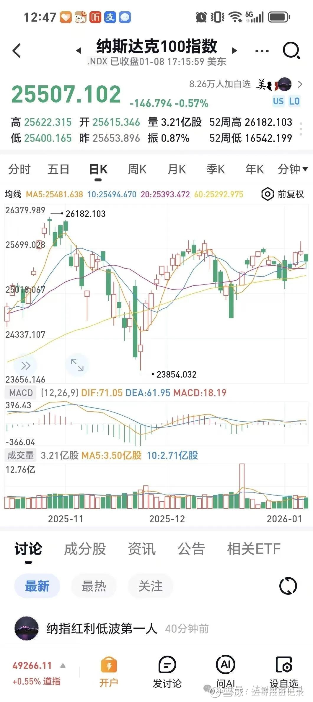 美股大盘新年处于震荡行情,标普和道指创历史新高,纳指因为市场担心AI泡沫,龙头科技股继续调整,8日美股收盘后纳指100最新数值是25507.10点,比历史高点26182.10点,下跌了675点,下跌幅度有2.58%,比上周四收盘的跌幅3.56%缩减了1个点,具体看下面的截图: