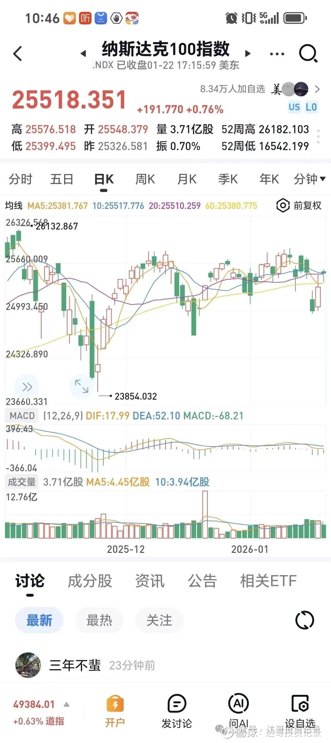 美股大盘本周初因为格陵兰岛事件,欧美有爆发关税贸易战的可能性,周二美股出现大幅下跌行情,但特朗普很快表示已经达成框架协议,原定2月1日征收10%的关税不会执行,美股连续两个交易日上涨,基本收复失地。22日美股收盘后纳指100最新数值是25518.35点,比历史高点26182.10点,下跌了663.75点,下跌幅度有2.54%,比上周四收盘的跌幅2.43%微微扩大了0.12%,具体看下面的截图: