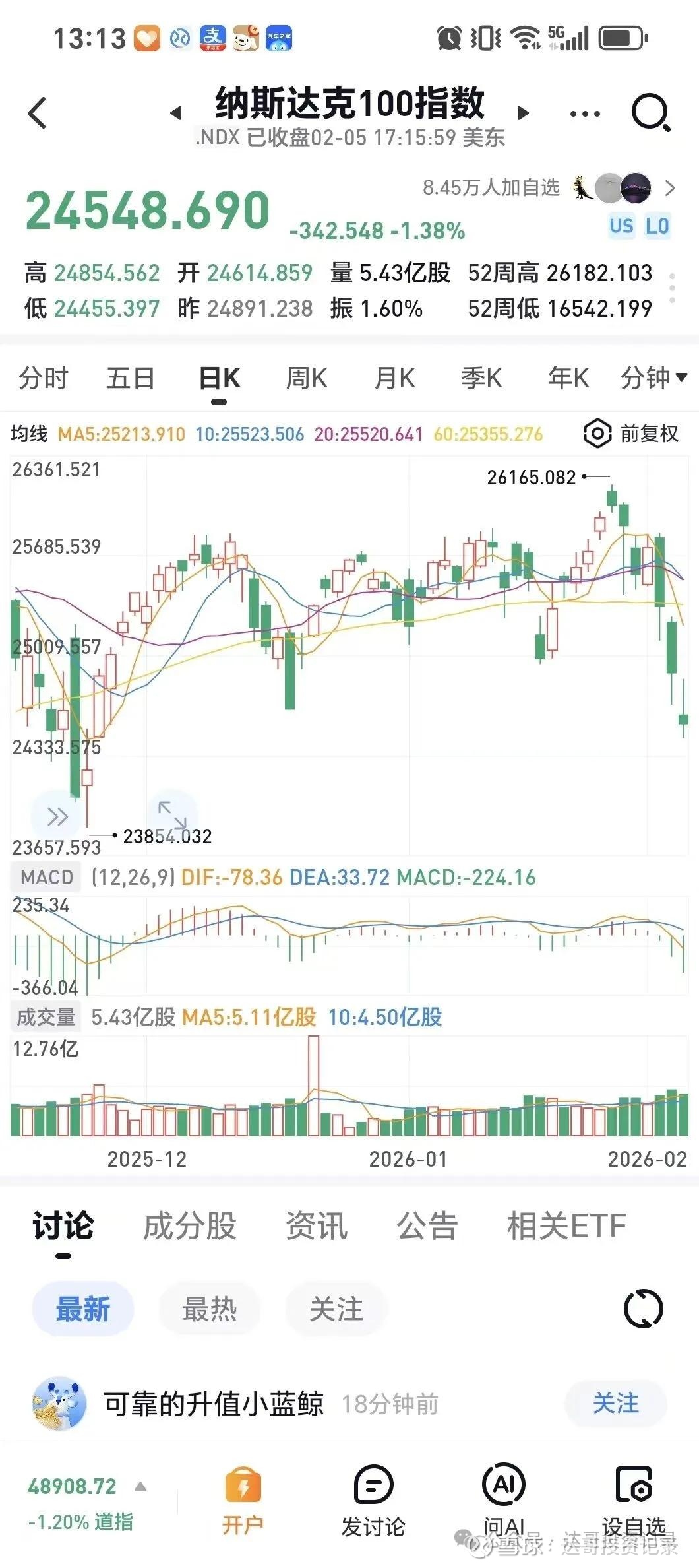 特朗普提名凯文沃什担任下一届美联储主席,引发资本市场大跌,特别是黄金白银及数字货币跌幅巨大,加上谷歌及亚马逊的财报显示2026年的资本开支大大超出市场预期,让市场担心AI投入巨大,但未必能够在未来数年可以给投资者带来相应收益,美股纳指跌幅比较大。2月5日美股收盘后纳指100最新数值是24548.69点,比历史高点26182.10点,下跌了1633.41点,下跌幅度有6.23%,比上周四收盘的跌幅1.14%扩大了5个百分点,具体看下面的截图: