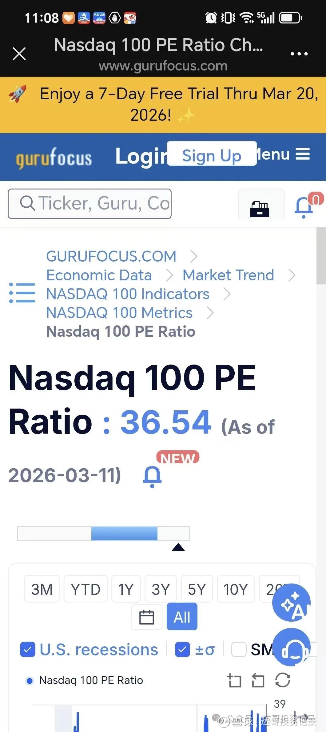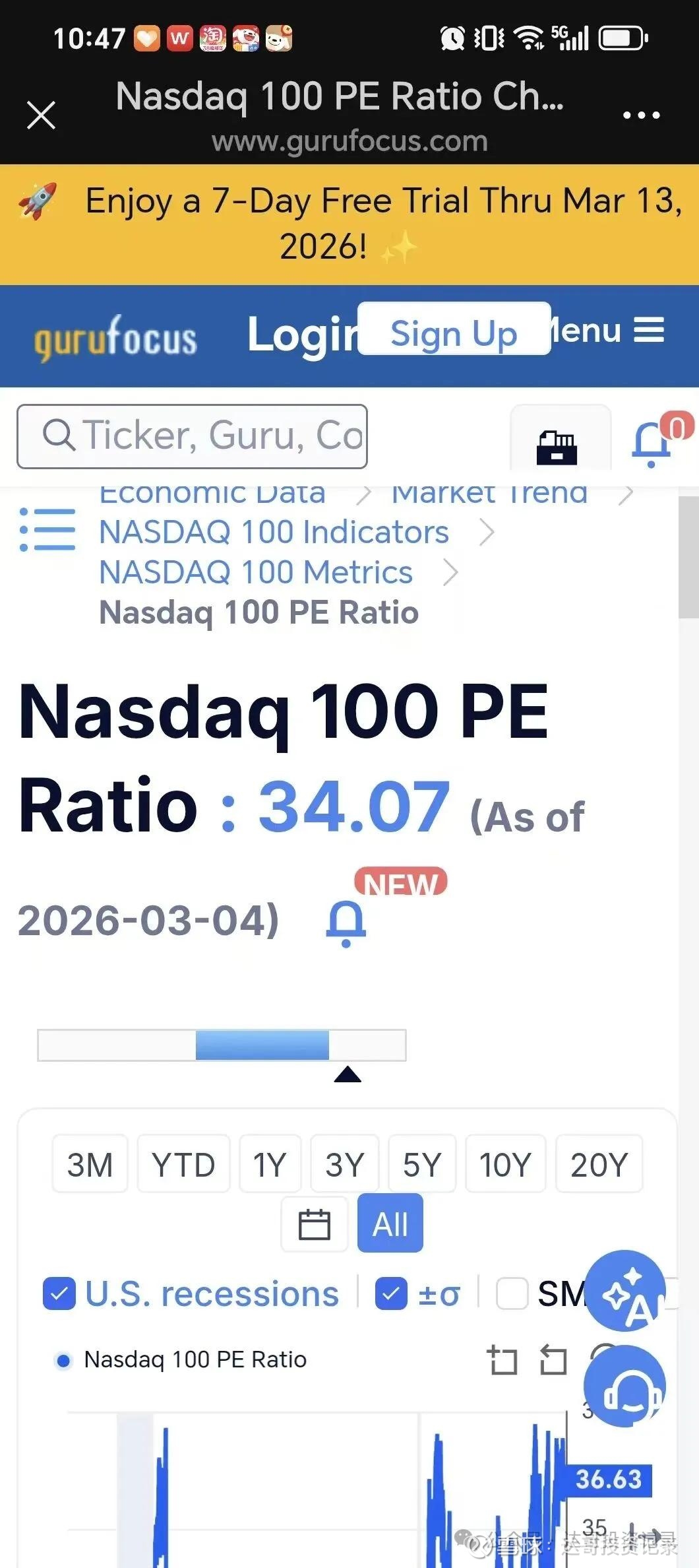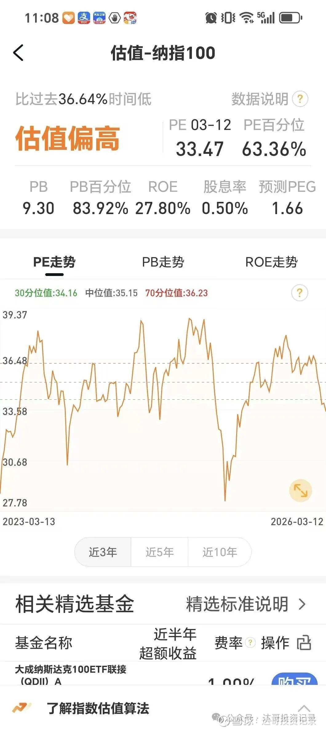 在上周的周记公众号文章里已经说明,价值大师网平台的pe数值又出现跳变,3月4日还是34.07倍,周五3月6日的纳指100下跌了1.5%,按照周四周五的跌幅计算应该是33.4倍左右,但平台显示pe数值是36.07倍,看了雪球app的最新数值是33.47倍,上周也没有哪家大公司发布财报,利润大幅下降的情况出现,个人猜测是价值大师网的计算基准出现偏差,估计是季度末要调整成分股品种,引发计算基准出现变化,再多观察几周的pe数值情况,这段时间先采用雪球APP的数值。