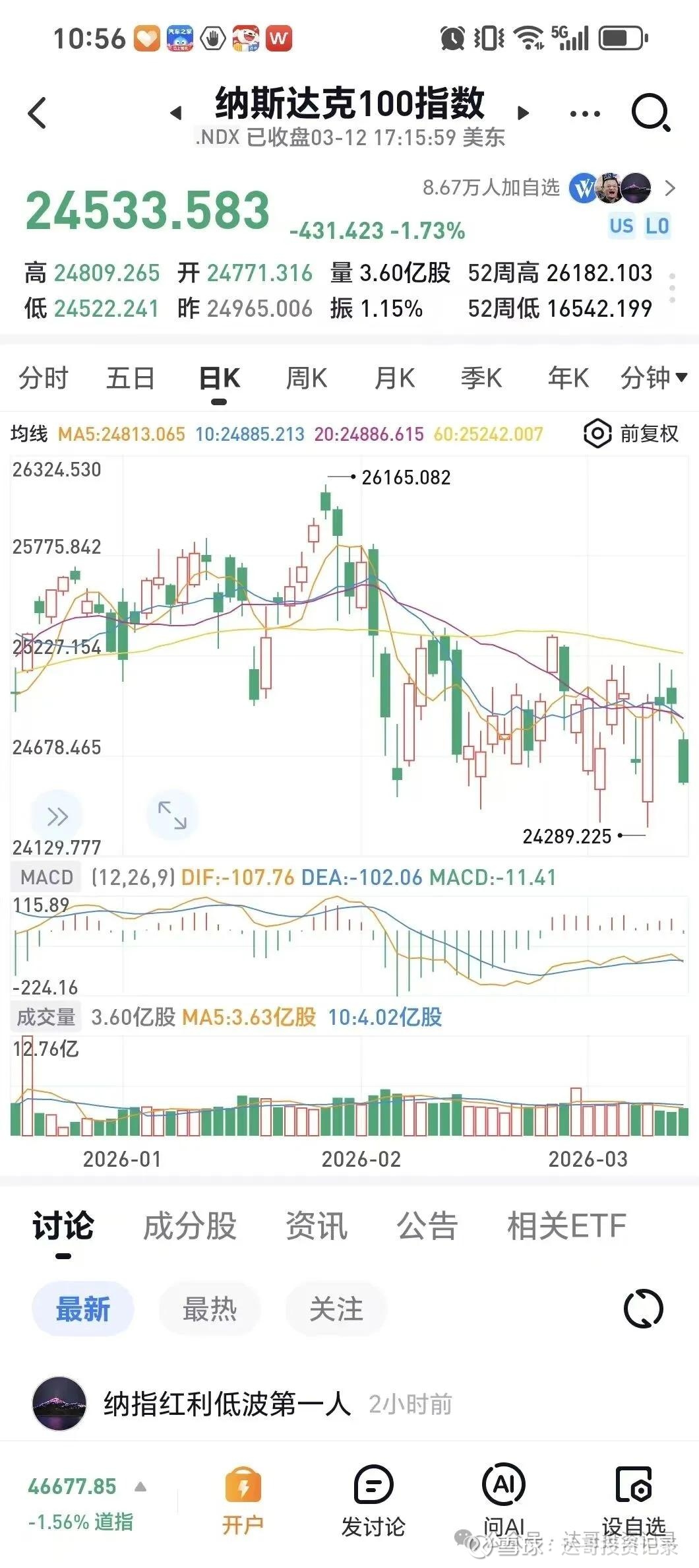 美以对伊朗的军事行动继续进行,霍尔木兹海峡被伊朗封锁断航,原油价格先涨后跌,美股也是波动较大,纳指100基本围绕25000点附近震荡。3月12日美股收盘后纳指100最新数值是24533.58点,比历史高点26182.10点,下跌了1648.52点,下跌幅度有6.30%,比3月5日收盘的跌幅4.44%扩大了1.86个百分点,具体看下面的截图:
