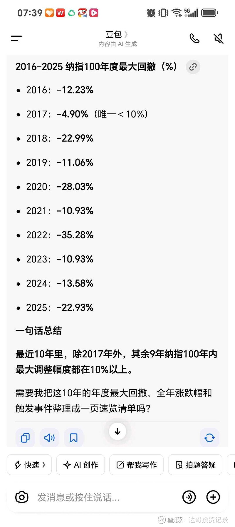 $纳指100ETF-Invesco(QQQ)$ 今年纳指从历史高位回撤幅度达到10%了,最近10年几乎每年都有调整10%以上的机会,除了2017年回撤幅度是4.9%。市场先生还是经常给低吸机会的$谷歌A(GOOGL)$ $英伟达(NVDA)$