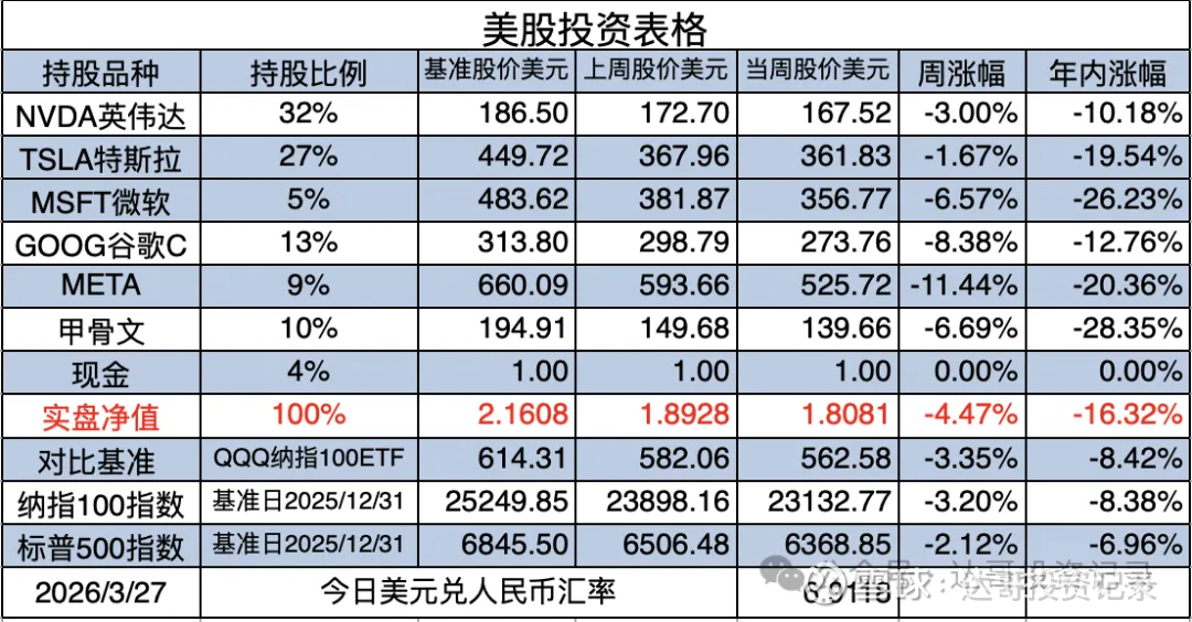 本周美股组合下跌4.47%,对比基准QQQ纳指100ETF周涨幅是-3.35%,标普500指数周涨幅是-2.12%,组合跑输纳指100及标普