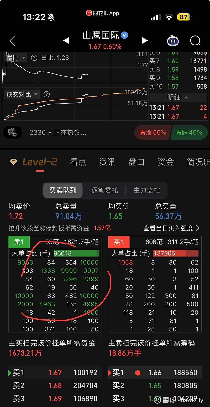 稍微有大单买,马上压下来,密密麻麻的大单压,不知想干嘛?