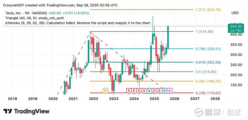 特斯拉(TSLA):继续其强劲的牛市走势,周线收盘首次突破440美元,创下历史上周线收盘新高,这表明牛市动能依然强劲。目前仍需突破444.72美元的阻力线,才能进一步创下历史新高,为未来甚至可能达到600至800美元打下基础。