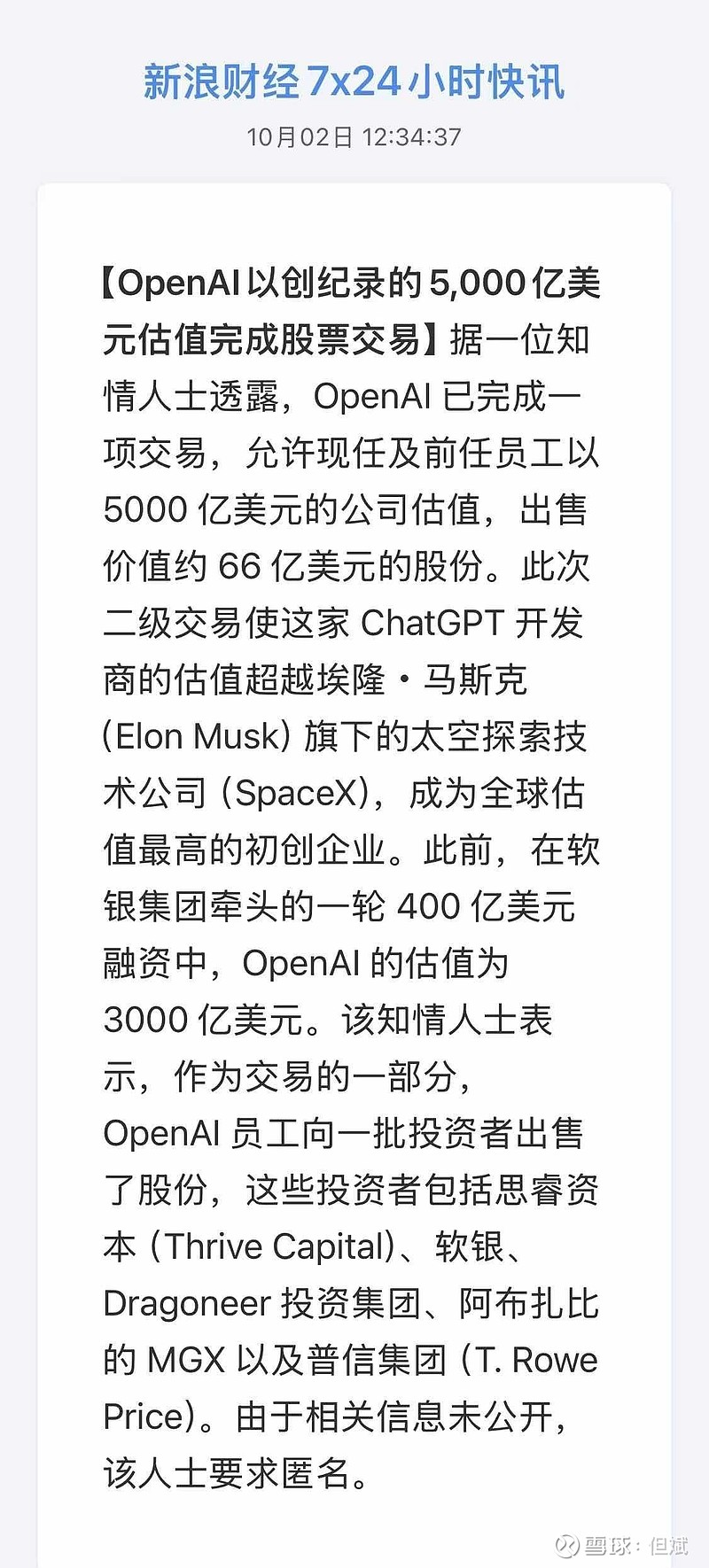 转:OpenAI已经完成了一项交易,允许现任和前任员工以5,000亿美元的估值出售价值约66亿美元的公司股票。此次二次出售使这家ChatGPT制造商超越马斯克旗下的SpaceX,成为世界上最有价值的初创公司。此前,在软银集团领投的一轮400亿美元融资中,OpenAI的估值为3,000亿美元。
