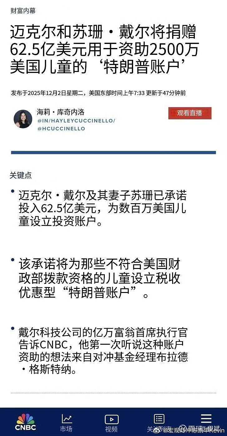转:2025年12月2日,戴尔科技创始人迈克尔·戴尔(Michael Dell)及其妻子苏珊·戴尔(Susan Dell)宣布了一项震撼全球的慈善承诺:捐赠62.5亿美元,为2500万名10岁及以下、未获得政府资金资格的美国儿童开设“特朗普账户”,每个账户注入250美元启动资金。这一举措不仅是美国历史上针对儿童的最大单笔私人捐赠,更标志着通过金融工具赋能儿童未来、重塑社会公平的新篇章。